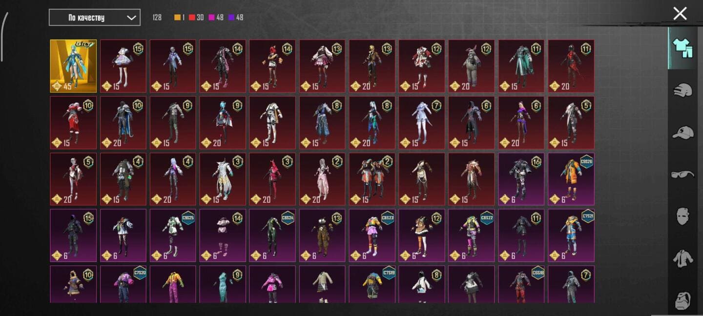 👚Топ костюмы: 48;⭐️Royale Pass: с 4 сезонна;🌈Скины на оружие: 150;