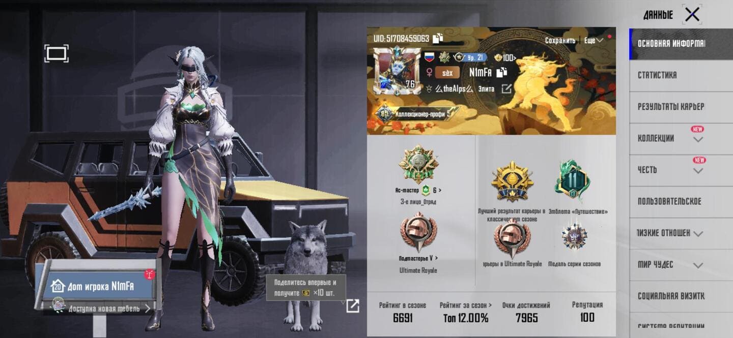👚 Костюмы: 26 🔫 Скины оружия: 13 ✨ Улучшенные: Mk14 "Галактическая позолота" (Lv.4), Томпсон "Изысканная сирень" (Lv.3) 🚗 Транспорт: 7 ⭐ Royale Pass: с 5 сезона 👤 Уровень: 66 🏆 Ранг: Корона
